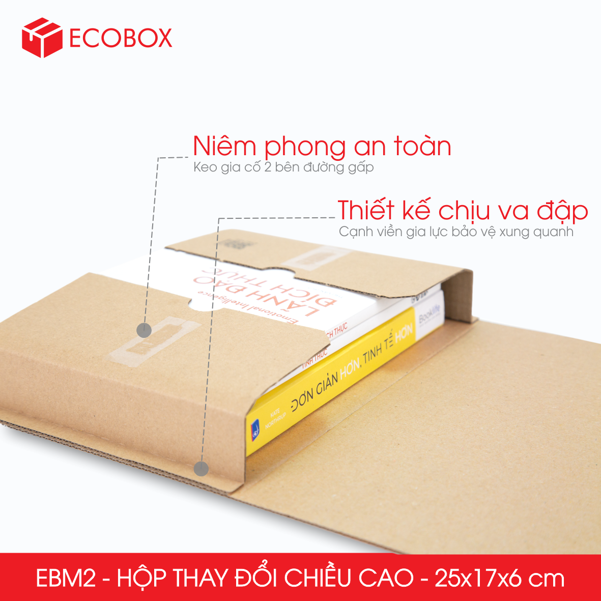 - Gia tăng khả năng bảo vệ sản phẩm: đường viền cạnh gia cố xung quanh mỗi chiều hộp là 1cm giúp chống va đập sản phẩm đóng gói bên trong.