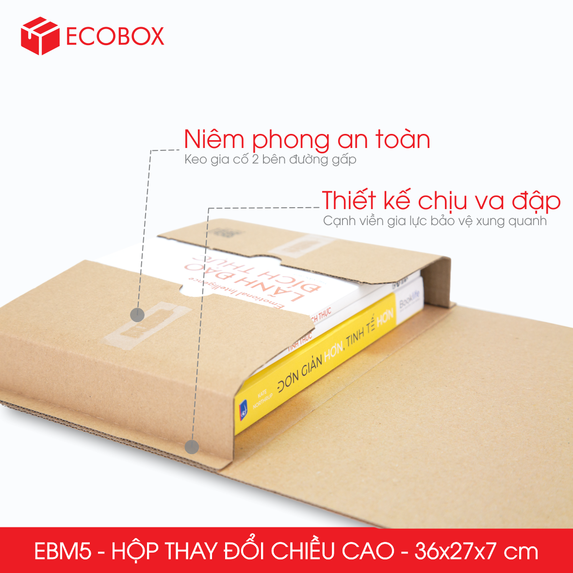 - Gia tăng khả năng bảo vệ sản phẩm: đường viền cạnh gia cố xung quanh mỗi chiều hộp là 1cm giúp chống va đập sản phẩm đóng gói bên trong.