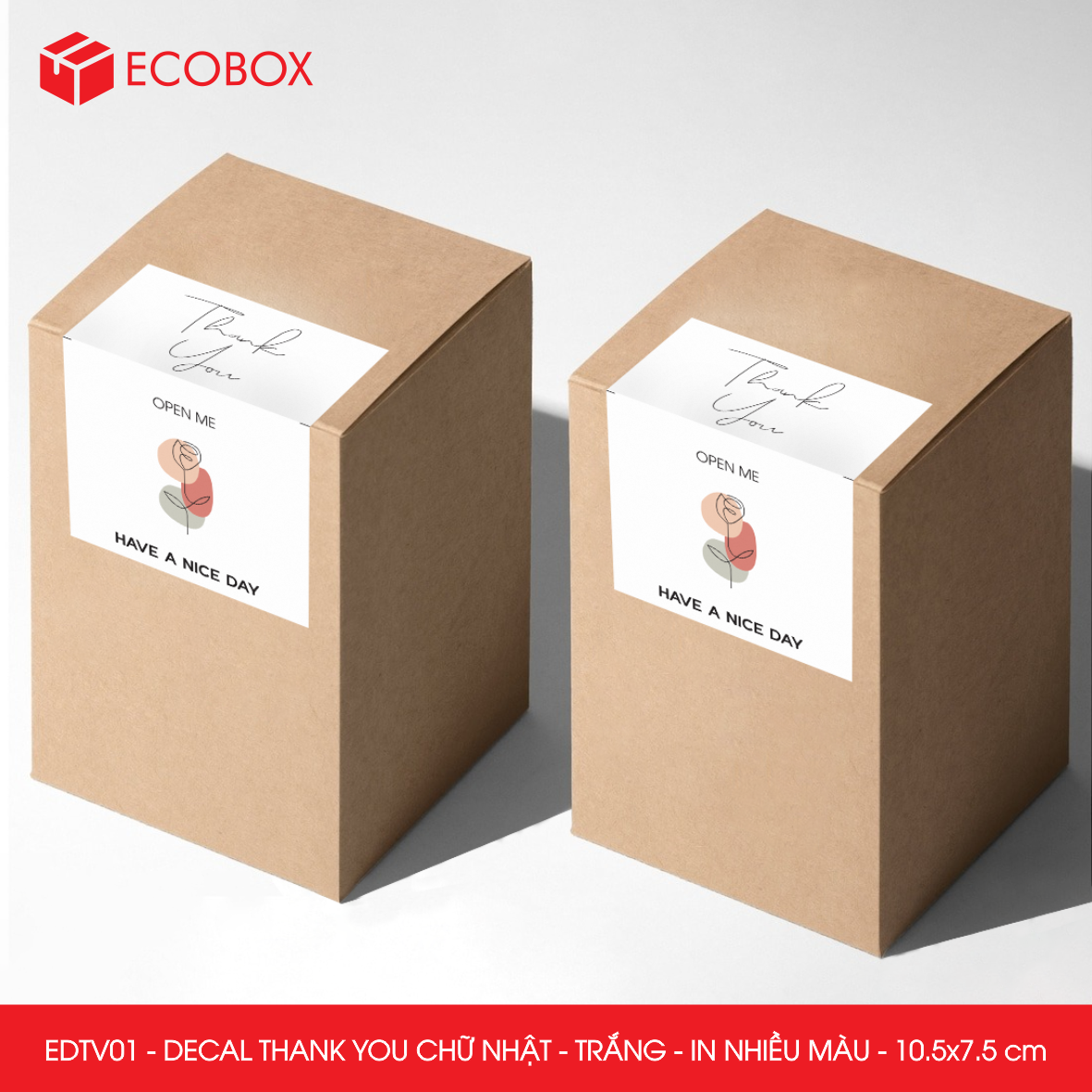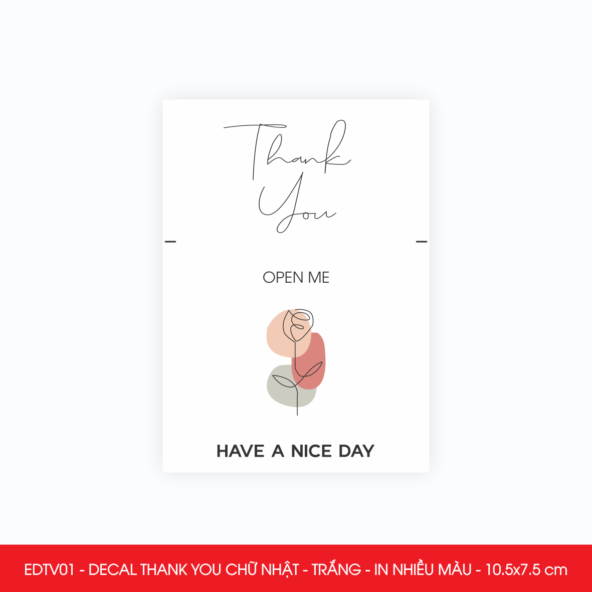 Decal - sticker Thank You là loại nhãn dán có nội dung "Cám ơn" được thiết kế theo hình chữ nhật. Decal Thank You thường được sử dụng để trang trí đóng gói thời trang, quà tặng… để thể hiện sự biết ơn, trân trọng tới người được nhận.