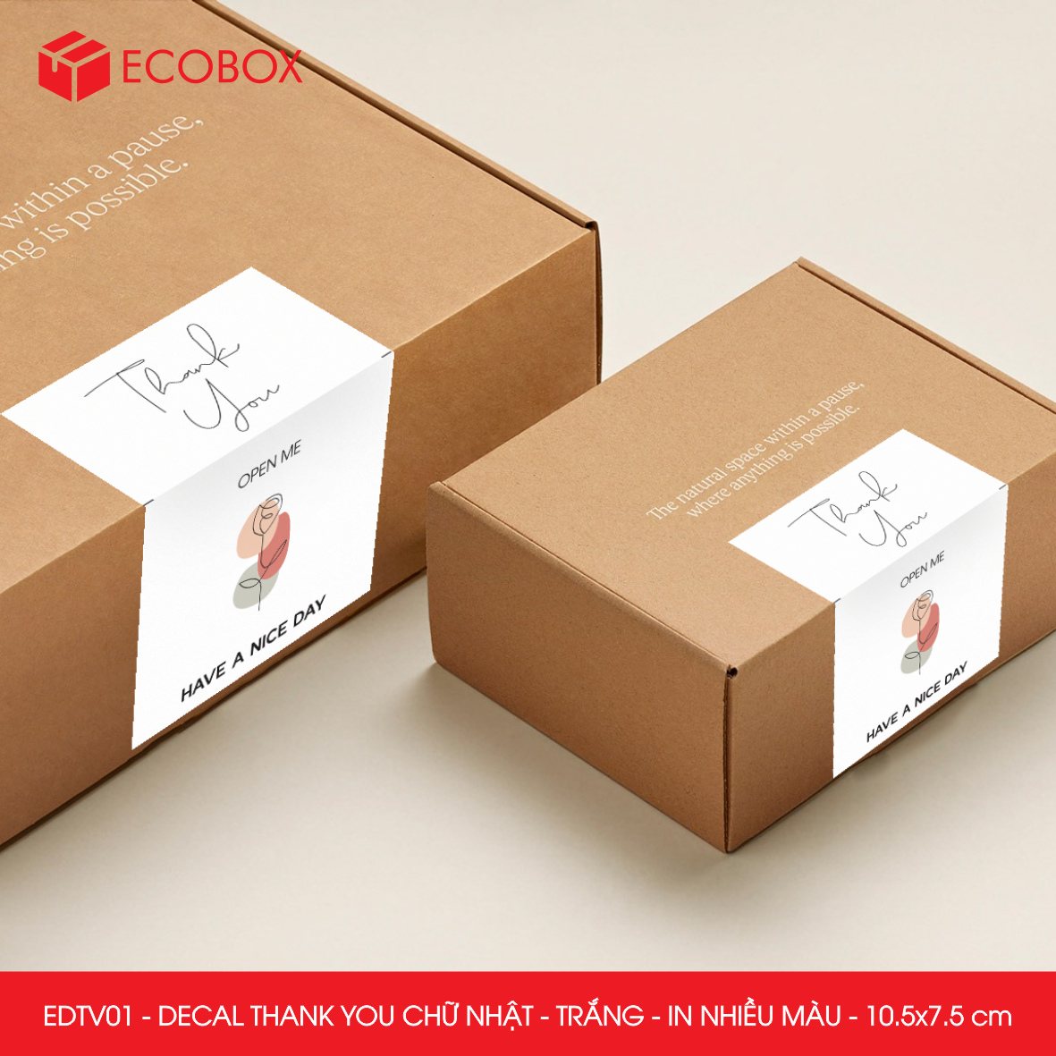 Chất liệu: Decal Thank You được làm từ giấy decal 3 lớp trên bề mặt được phủ thêm 1 lớp màng mờ, tăng khả năng chống thấm nước giúp decal bền hơn. Ngoài ra khi cán thêm lớp màng mờ sẽ giúp món quà trở lên sang trọng và bắt mắt hơn.