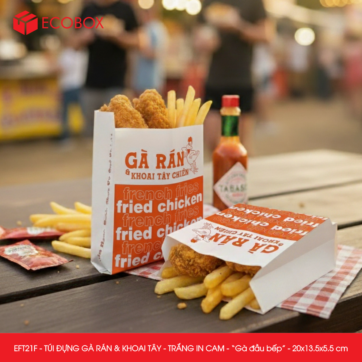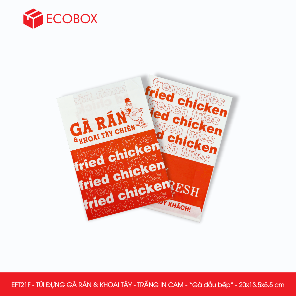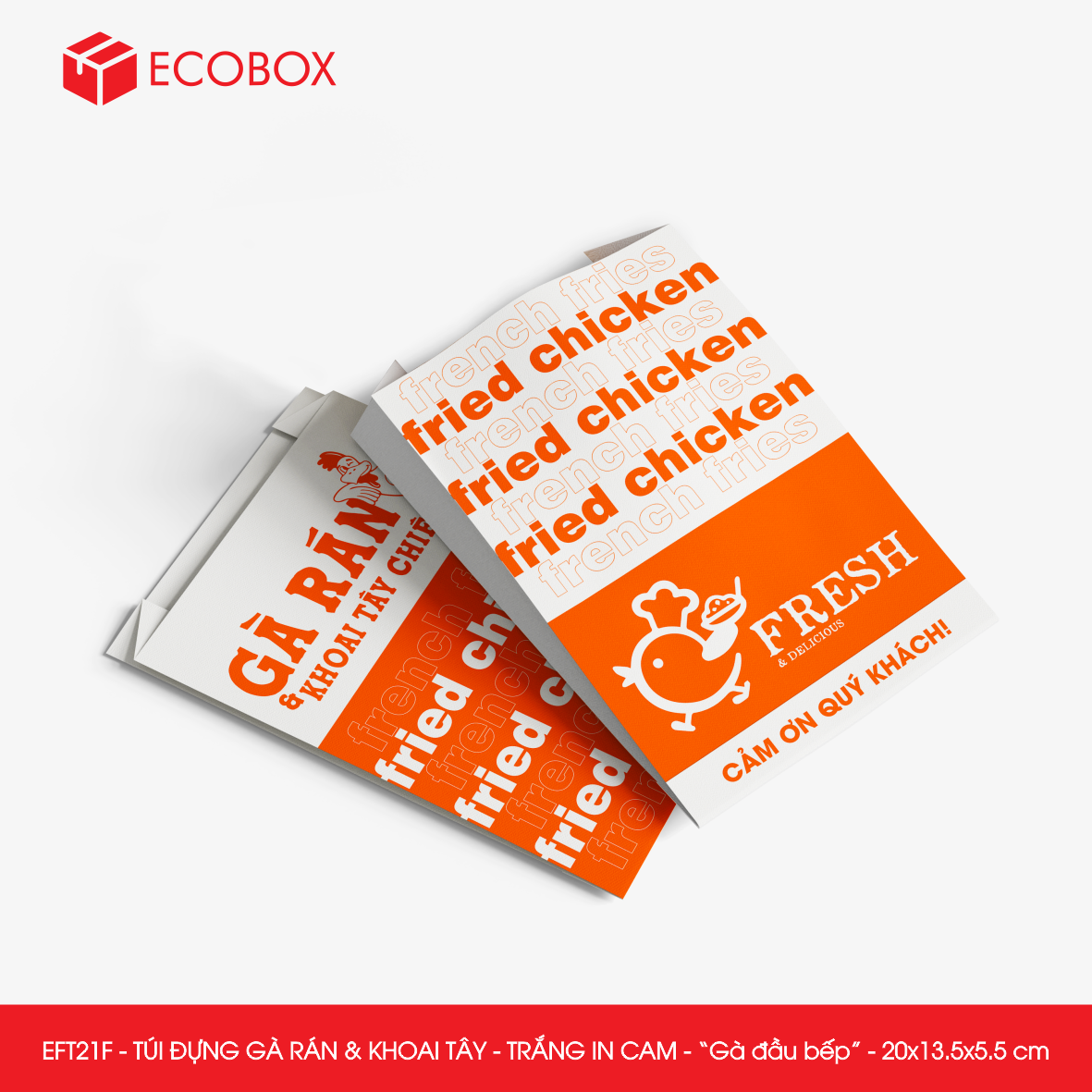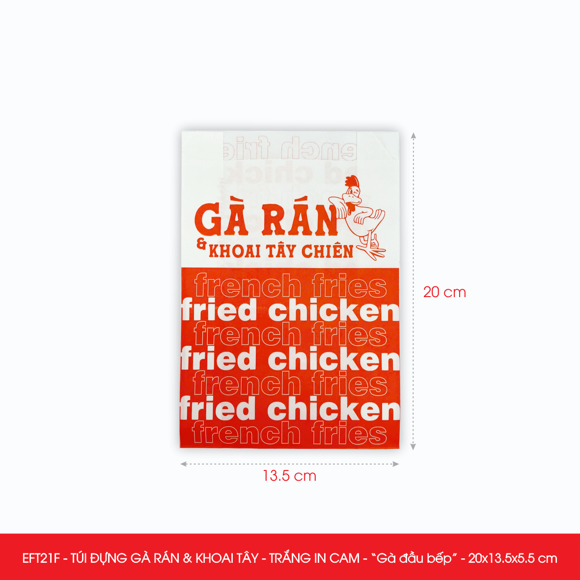 • EFT21F - Túi giấy đựng gà rán & khoai tây chiên - Trắng - In cam - ""Gà đầu bếp""