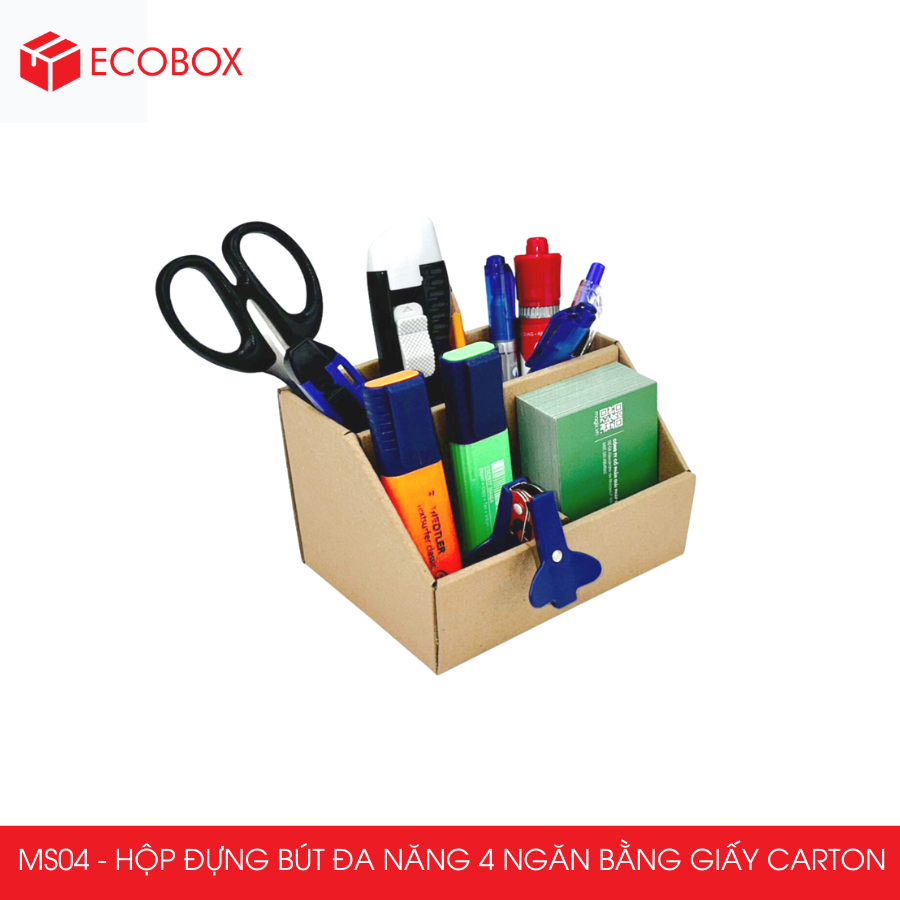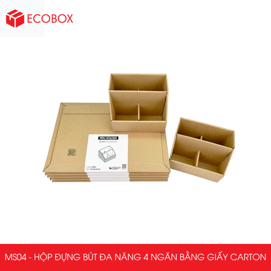 Chất liệu: ES04 - Hộp đựng bút 4 ngăn được làm từ giấy carton 3 lớp sóng E cao cấp, giúp cho sản phẩm gọn nhẹ nhưng vẫn đảm bảo độ bền cao.