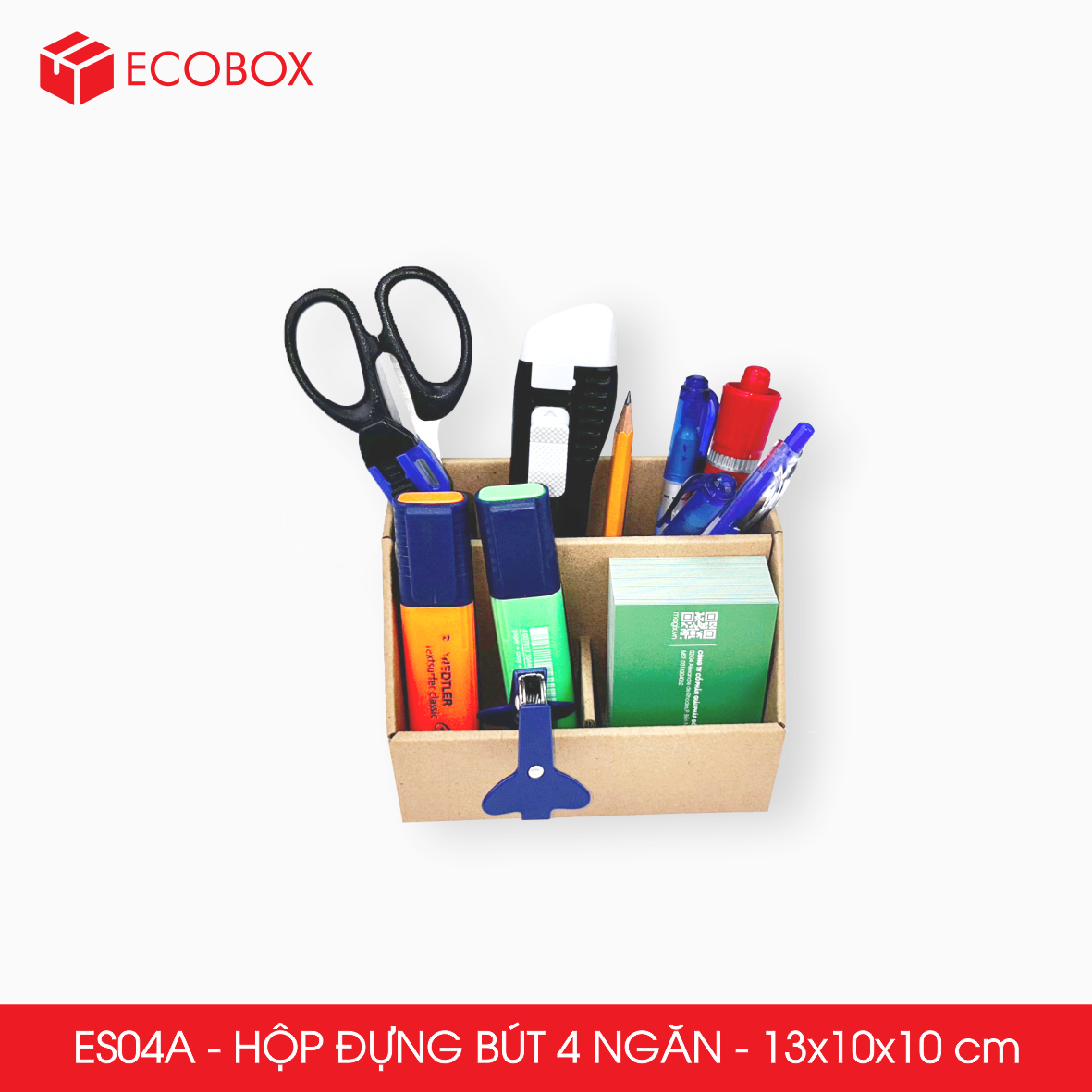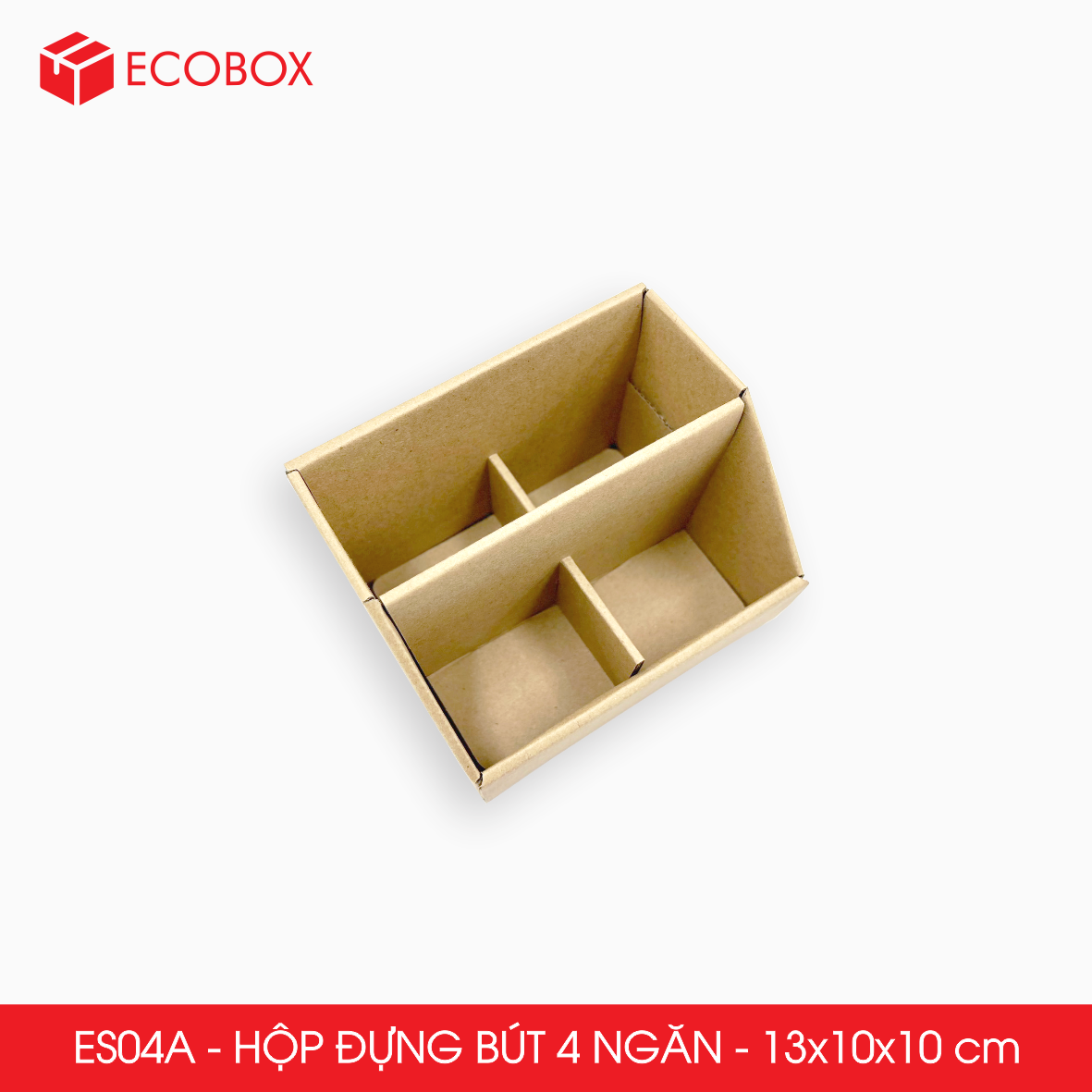 Chất liệu: ES04 - Hộp đựng bút 4 ngăn được làm từ giấy carton 3 lớp sóng E cao cấp, giúp cho sản phẩm gọn nhẹ nhưng vẫn đảm bảo độ bền cao.